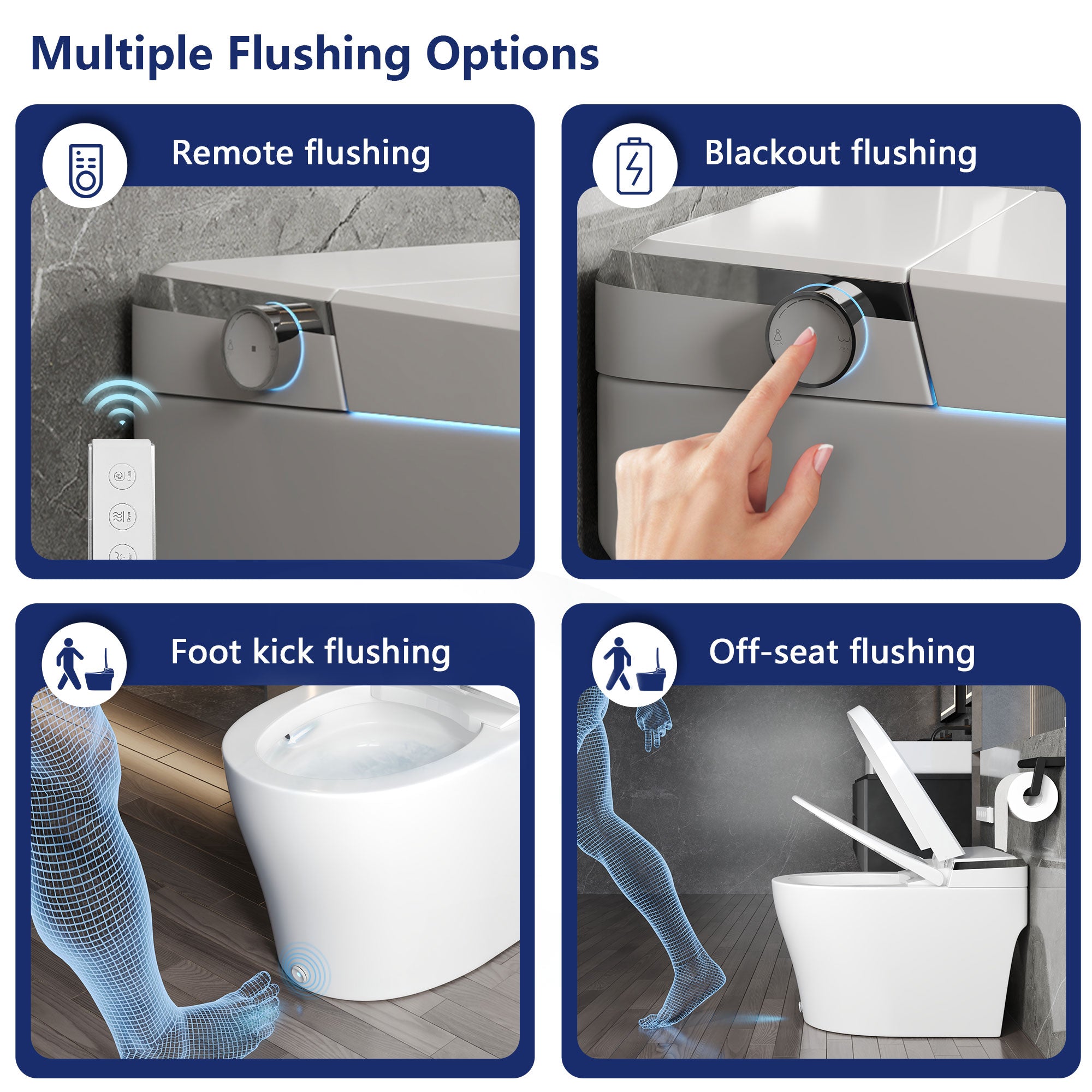 • More thoughtful Design: Off-seat automatic flush, lumbar protective foot kick flush to avoid bending too much, a manual knob for blackout flush, and remote flush. Totally free your hands from the complicated flushing way.(save more time for life!).