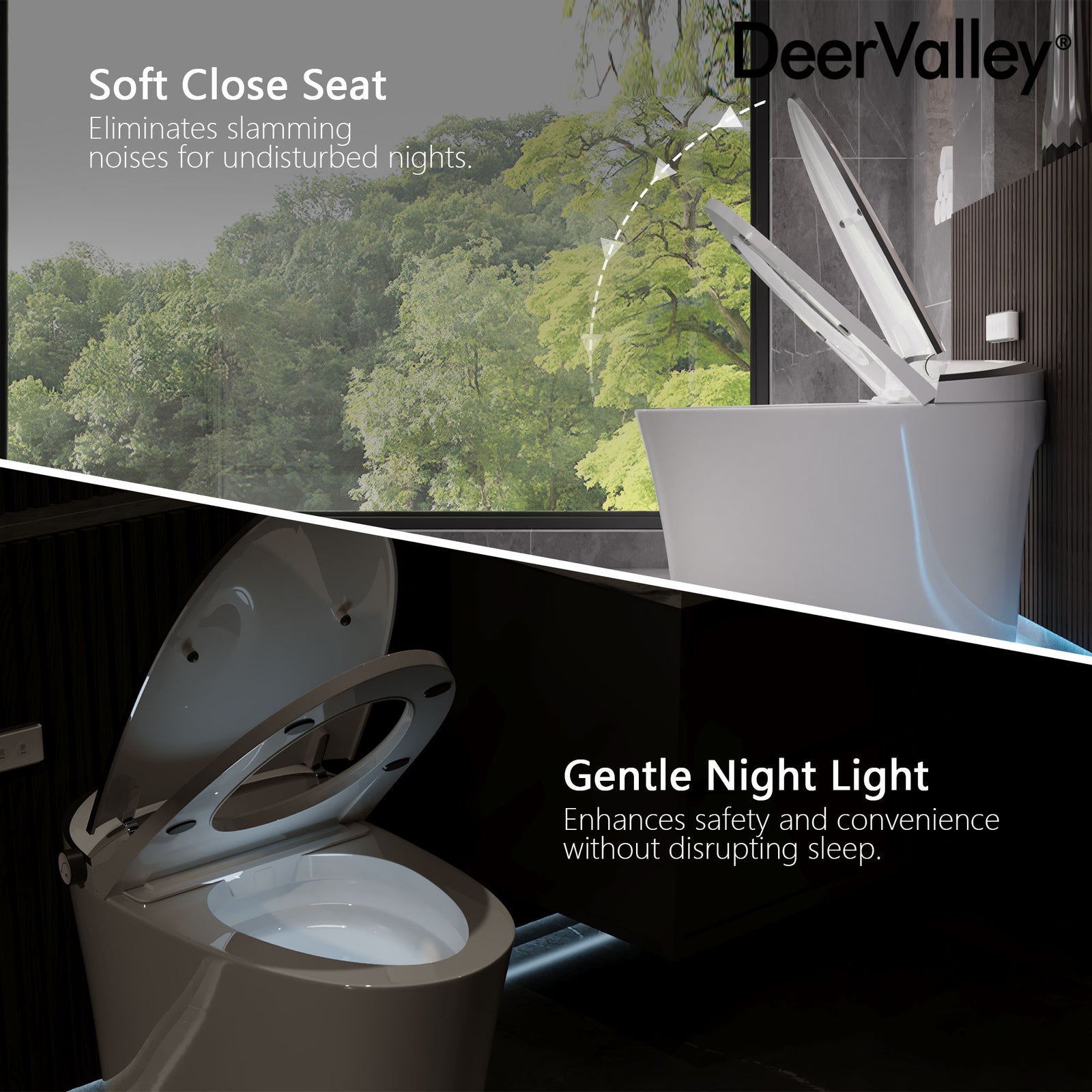 Une lumière douce et sensible vous guide dans l'obscurité. Le couvercle se ferme silencieusement sans déranger votre famille.