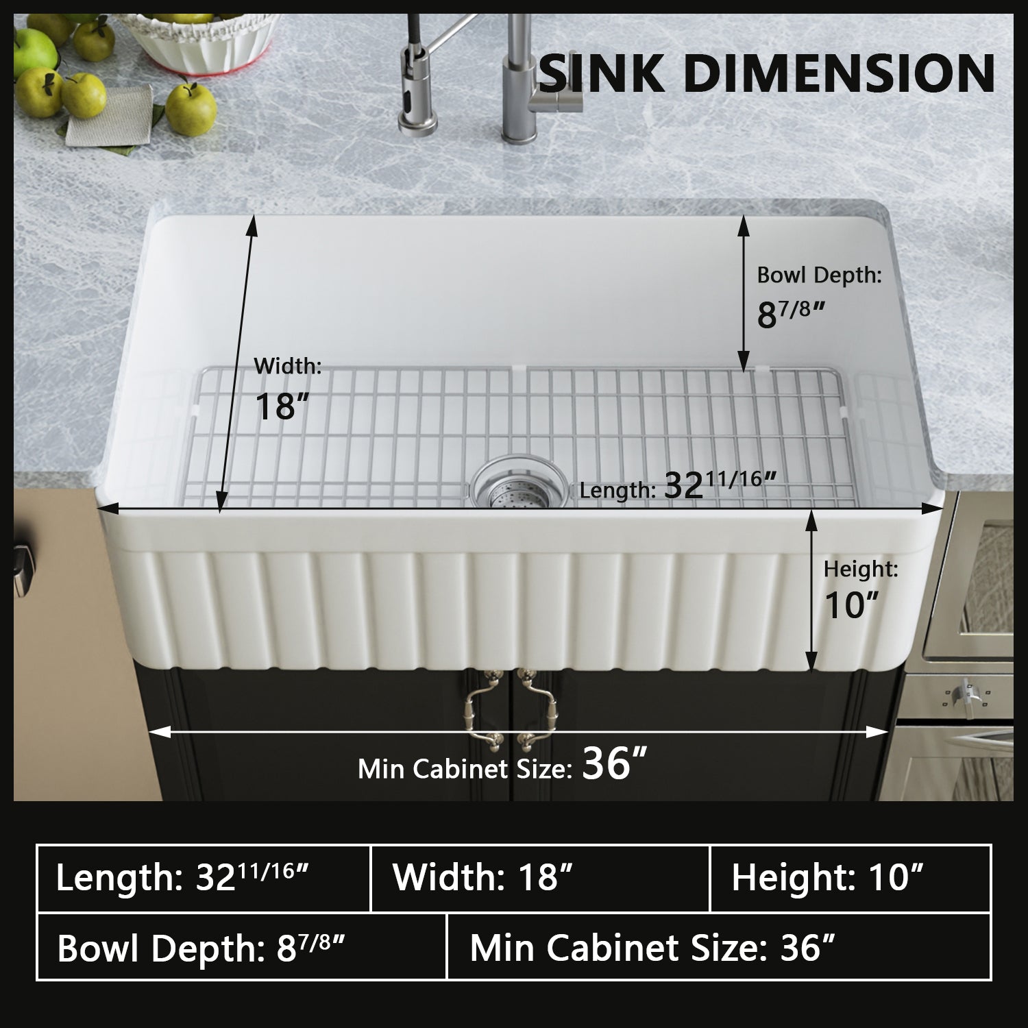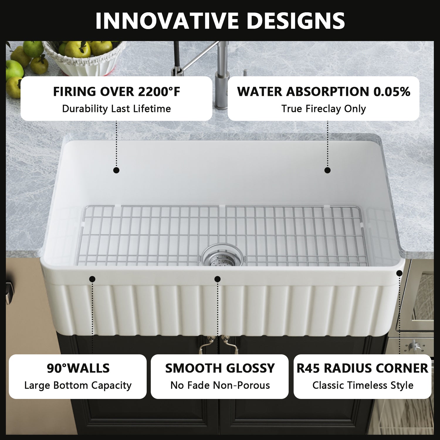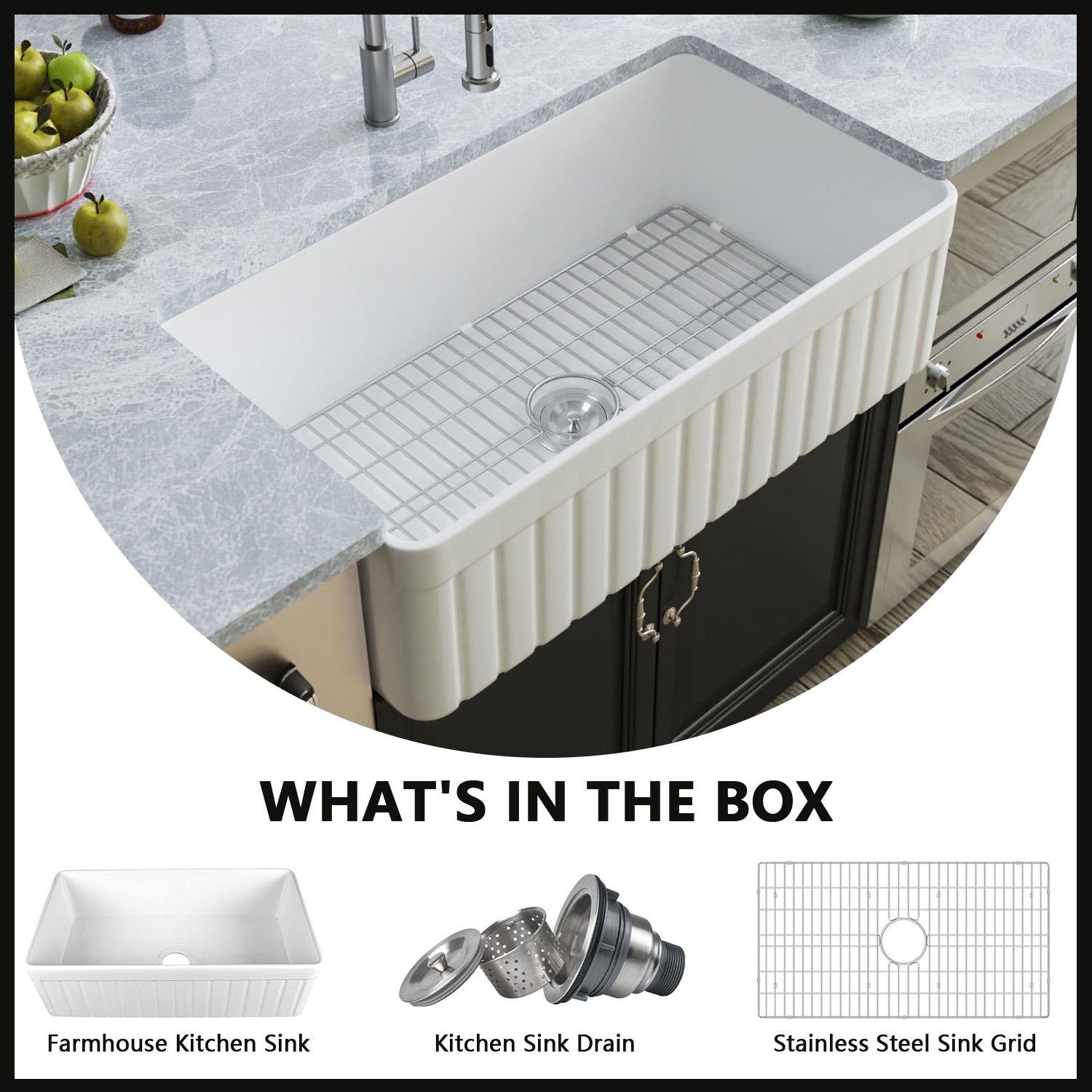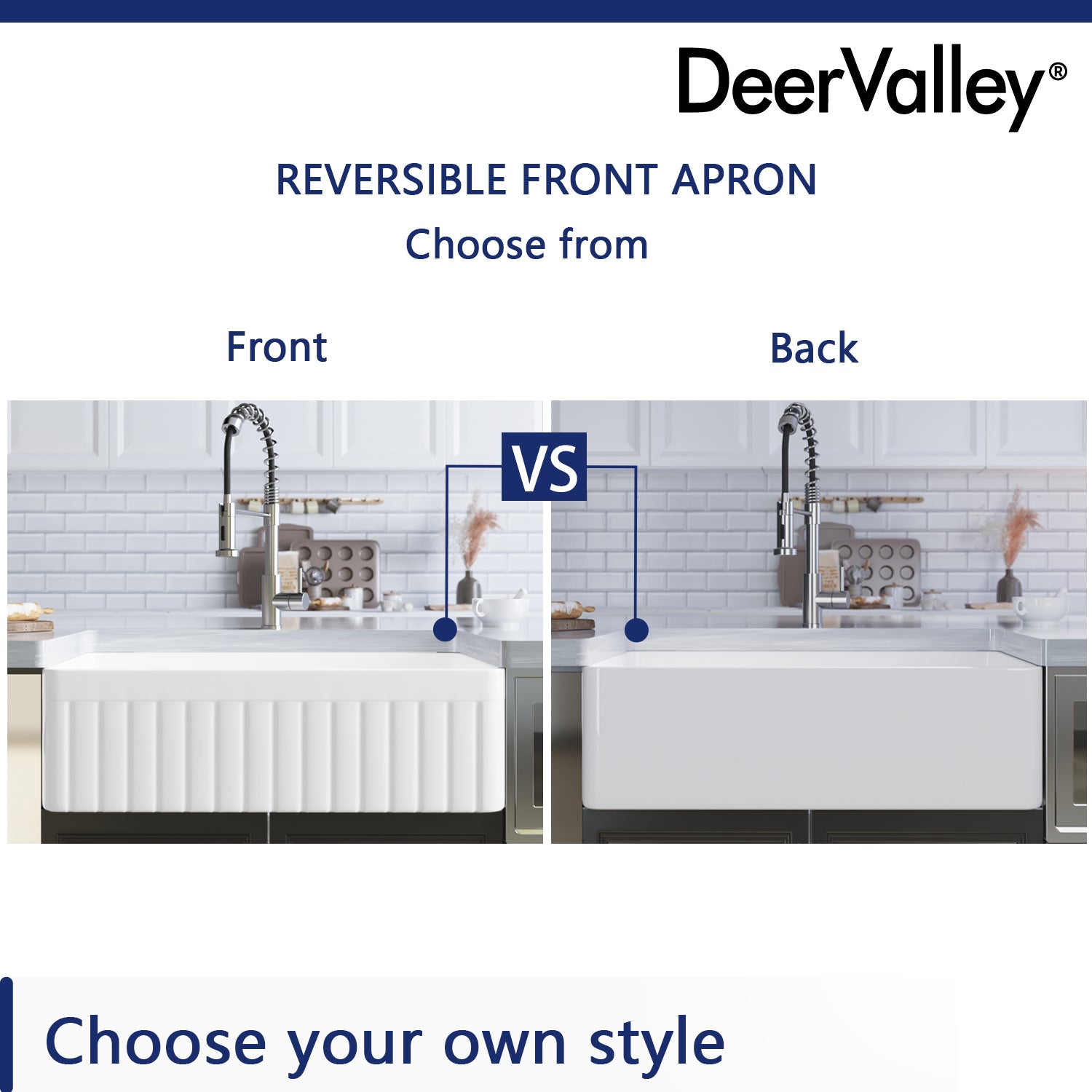 • White farmhouse fireclay porcelain reversible single bowl apron kitchen sink, you can choose which side to use as the front according to your decorating style.