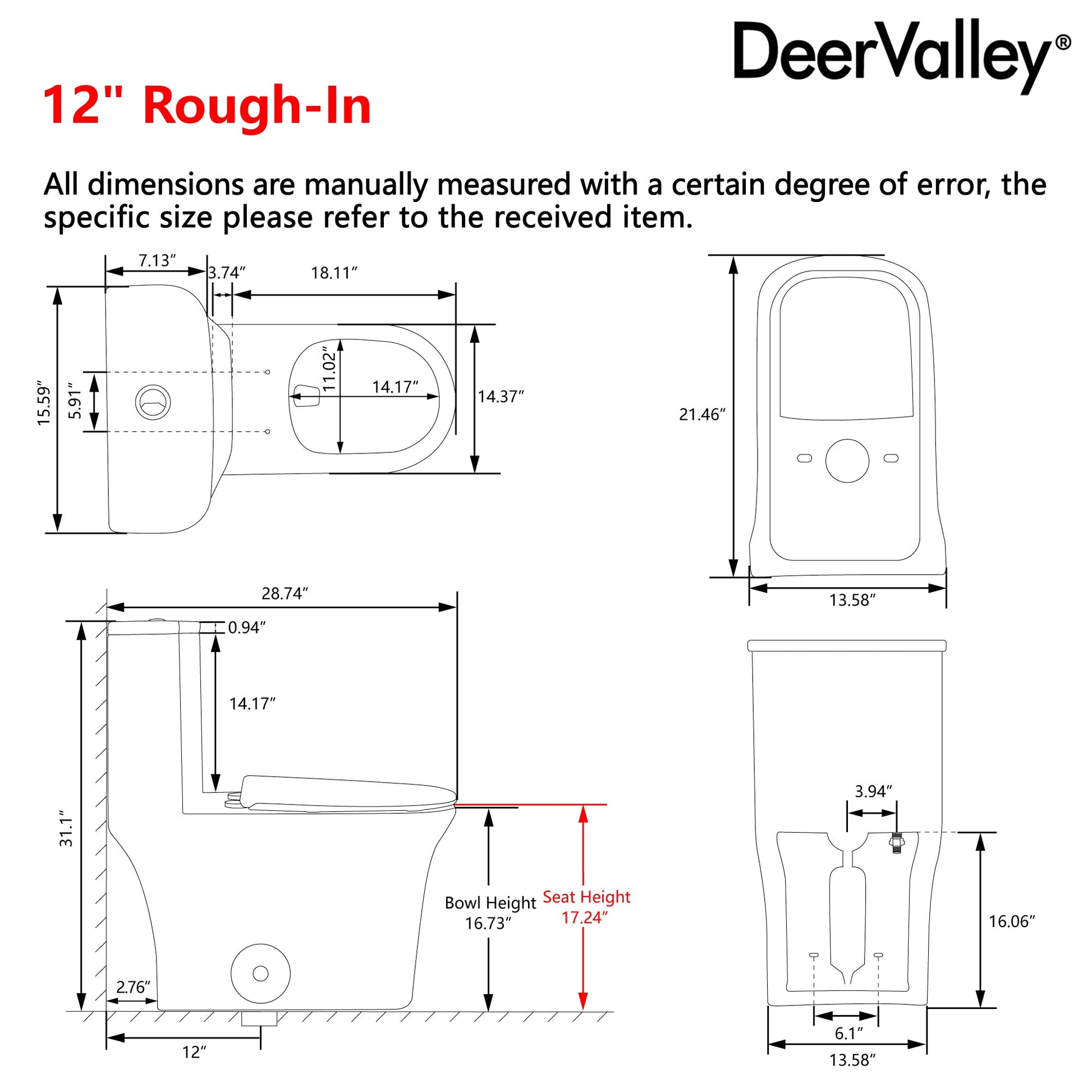 Overall: 28.74"L X 15.55"W X 31.1"H Rough In Size: 12" Toilet Seat Height - Top to Bottom: 17.25" Bowl Height - Top to Bottom: 16.73" Tank: 14.17"H X 15.12"L X 6.93" W Tank Lid: 0.95"H X 15.59"L X 7.13" W Bolts Spread Distance: 5.9" Distance from the Seat Installation Hole to the Tank: 3.74" Distance from the Back of the Toilet to the Wall: 2.76" Toilet Installation Hole Distance: 6.1" Height from the Bottom of the Water Tank to the Ground: 16.06" Distance Between the Center of Adapter and the Center of Trapway: 3.94" Trapway Diameter: 2.36"/3.15" Toilet Seat: 1.38 Back/ 0.79 Front " H X 14.37" W X 18.11" L Toilet Seat Inside Ring: 8.27"W X 12.60" L Bowl: 14.17"L X 11.02" W X 16.73 H Toilet Base Dimension: 21.46" L X 13.58" W Overall Product Weight: 132 lb. Flush Volume: 1.1/1.6 GPF |