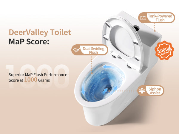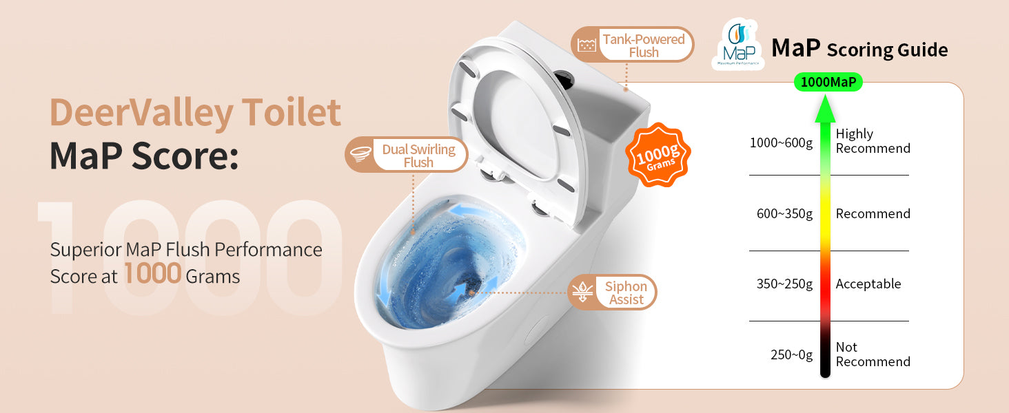 MaP (Maximum Performance) measures how many grams of waste a toilet can remove in one flush. Ratings range 250–1,000g; higher = stronger performance.