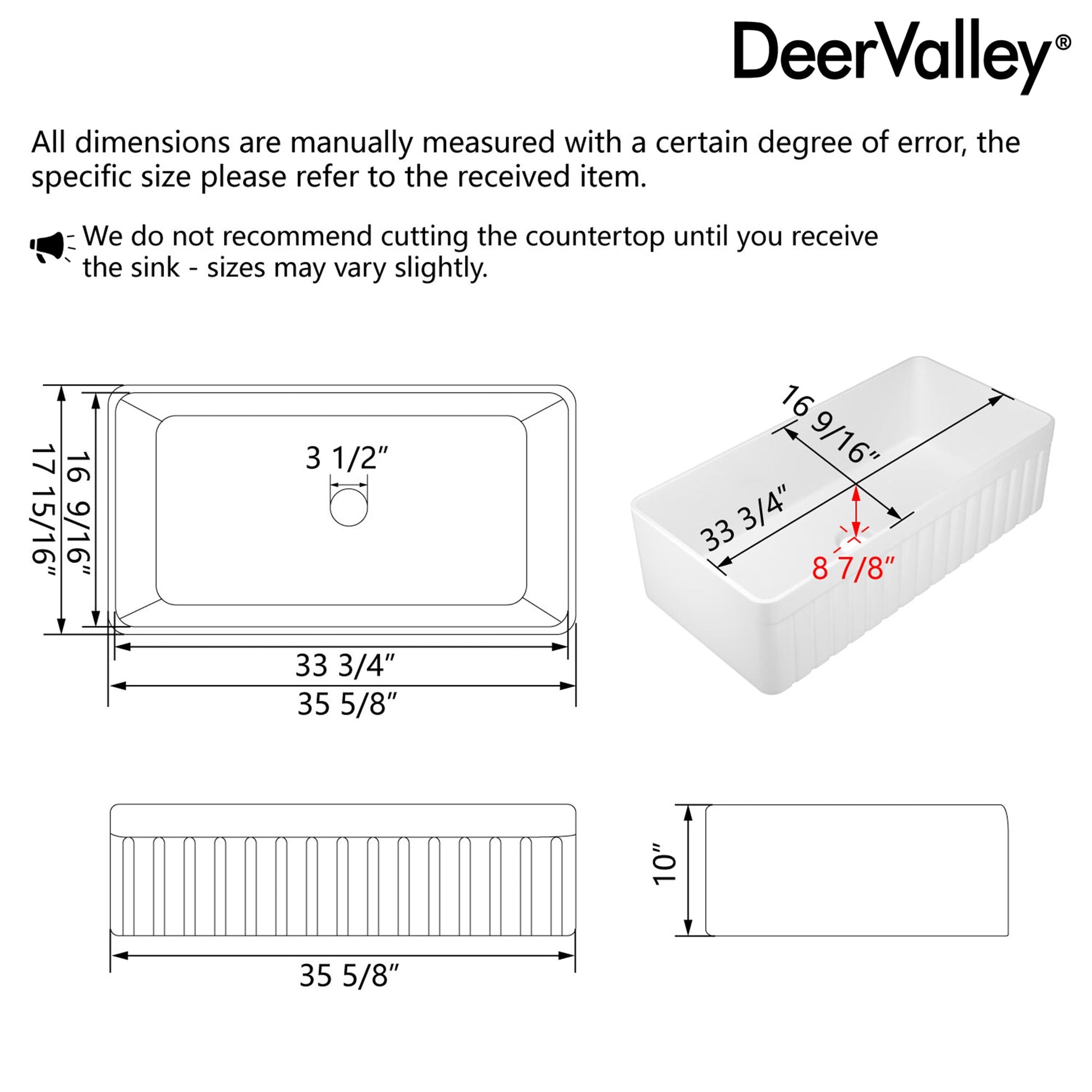 EXTRA LARGE SIZE & DEPTH: DeerVally upgraded the size of this 35 5/8" x 17 15/16" apron-front kitchen sink with a straight-wall interior design and easy-to-clean rounded corners shaped to provide a spacious workspace, and a " trough depth for cleaning large cookware for heavy-duty kitchen tasks.