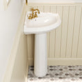 Crafted from durable, non-porous ceramic with scratch-durable properties, this corner pedestal sink showcases a sleek European design in a stylish white finish. Perfect for both home and business settings such as kitchens, bars, and hotels, it optimizes space with its triangular shape. Complete with effective drainage featuring a 1.75-inch drain opening and overflow prevention system, it blends functionality with refined style for an upscale bathroom enhancement.