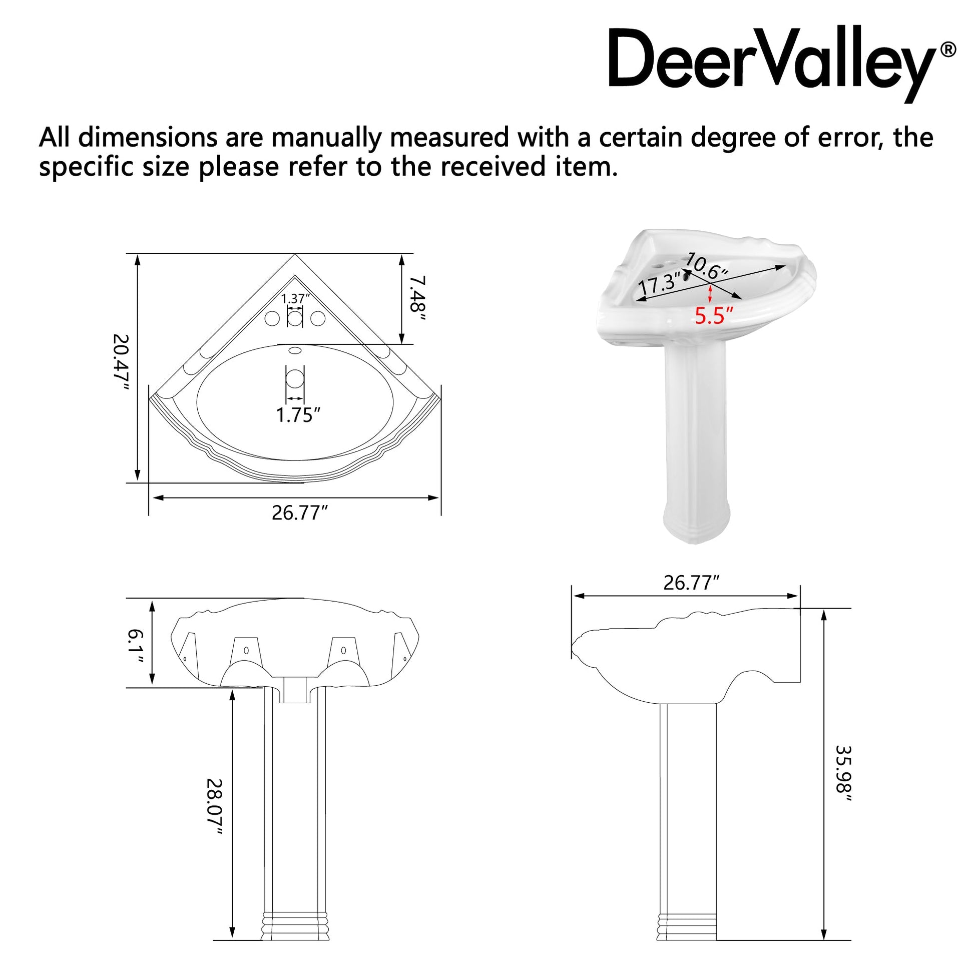 DYNASTY 26.77"L Triangle Pedestal Bathroom Sink, Overflow Hole