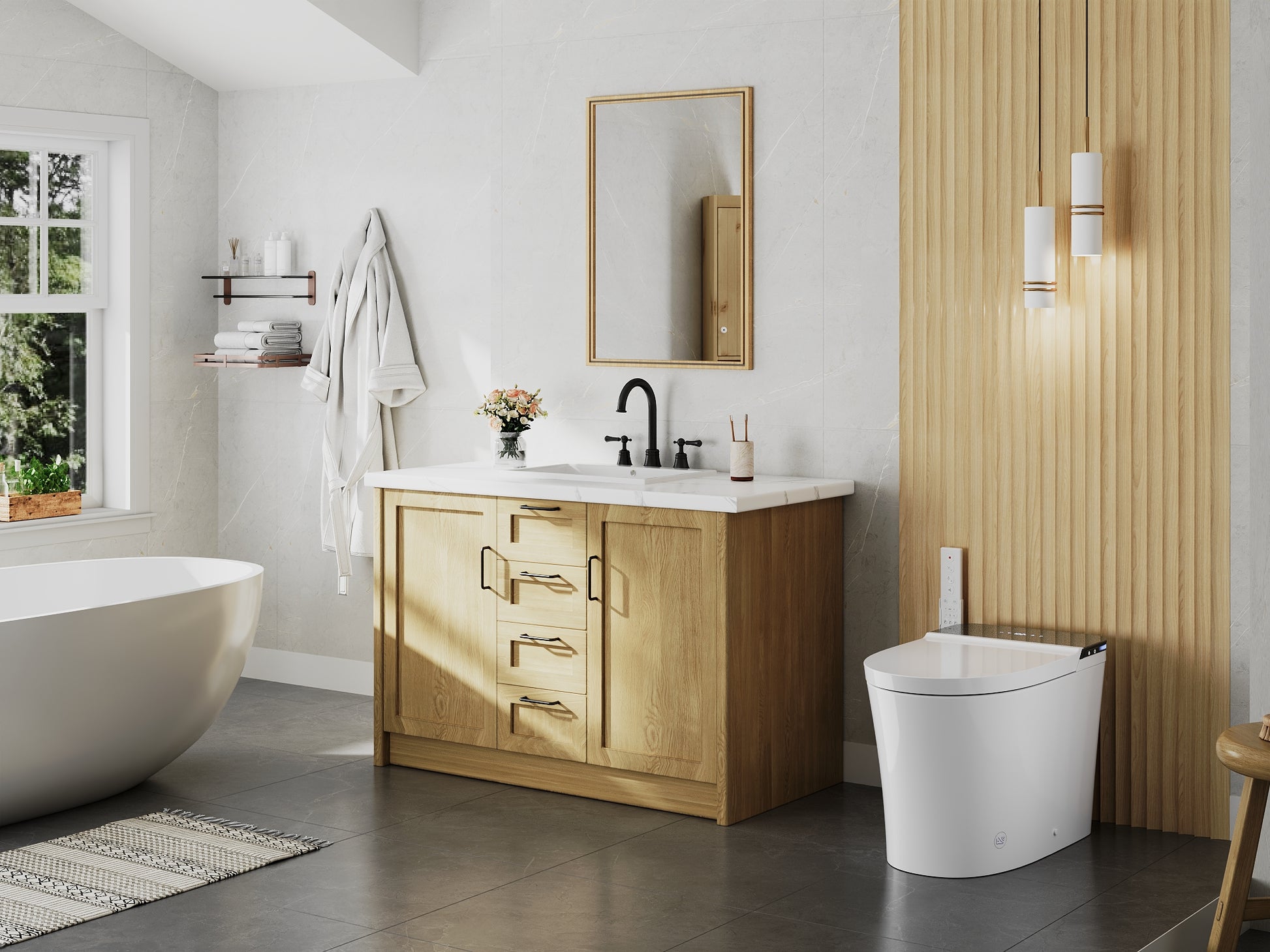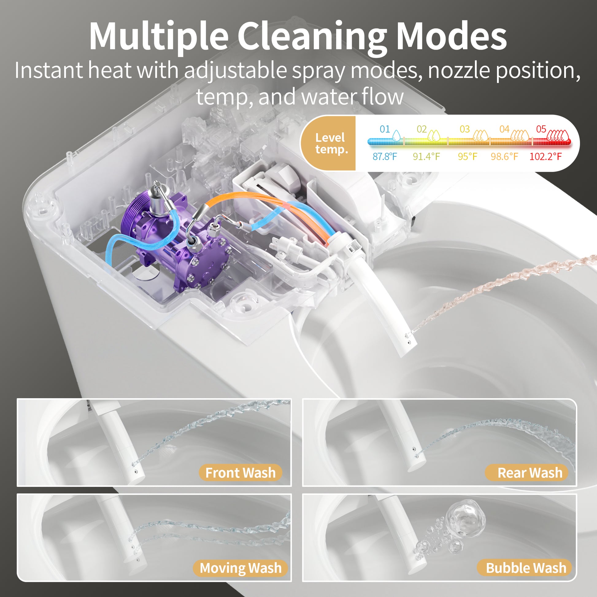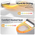 Heated Seat & Warm Air Dryer: - Stay cozy with 5 adjustable seat heating levels (86–100.4°F) and 5 warm air drying levels (95–131°F). This bidet toilet delivers year-round comfort and hands-free hygiene, eliminating the need for toilet paper.