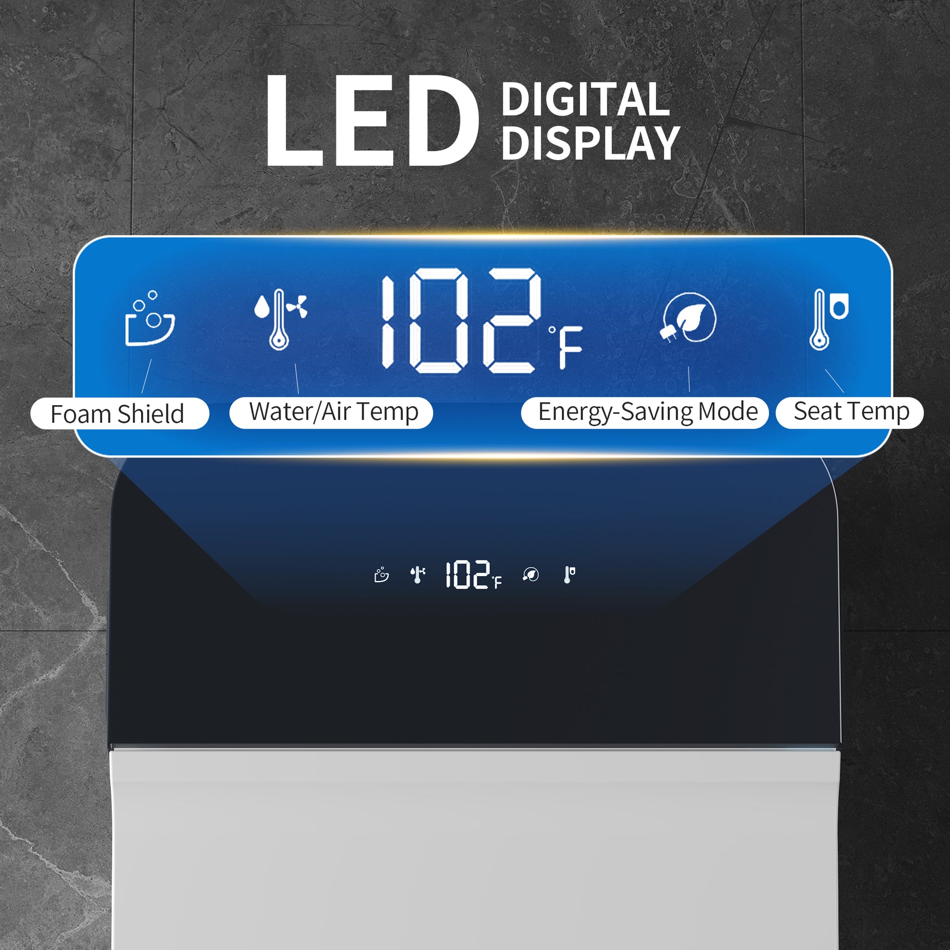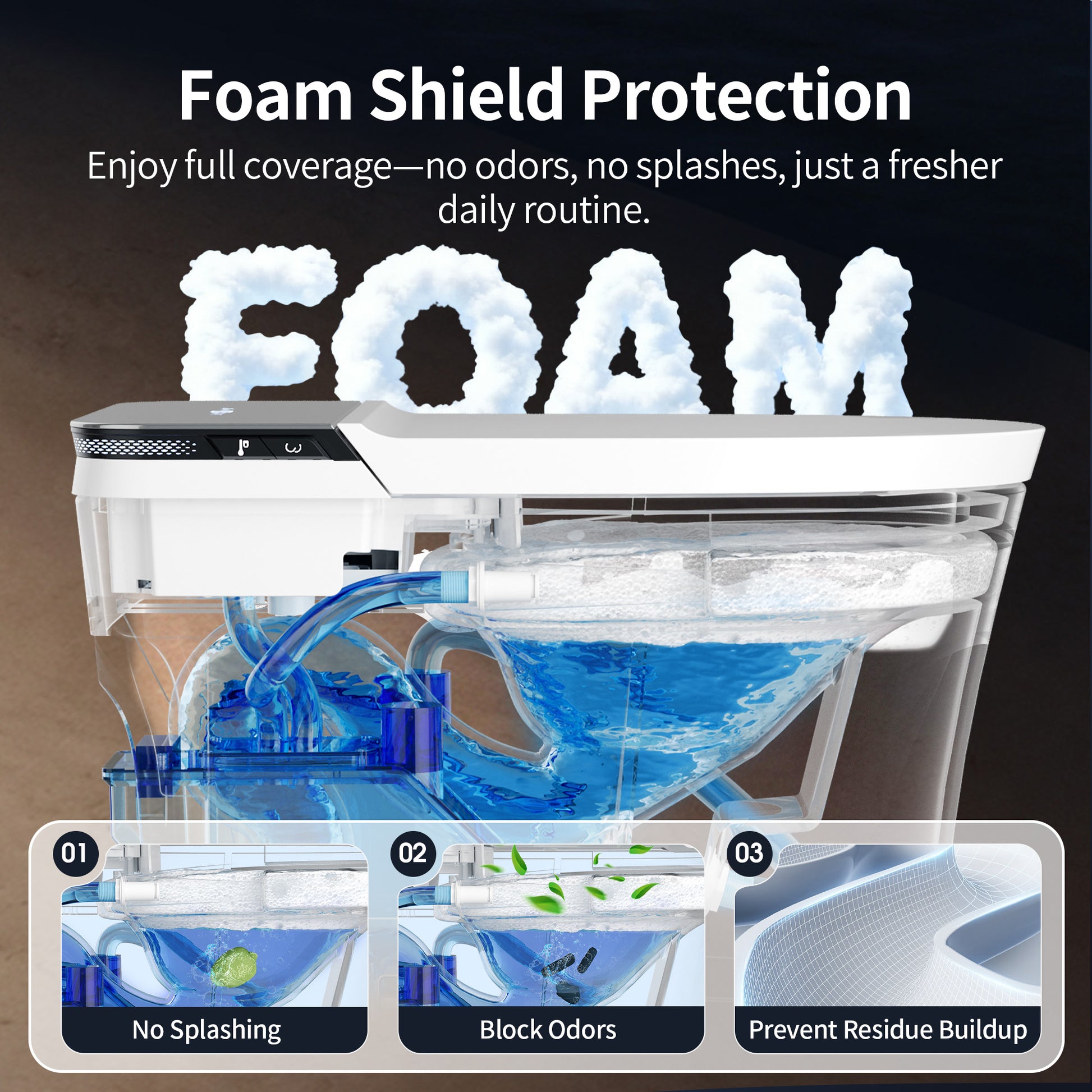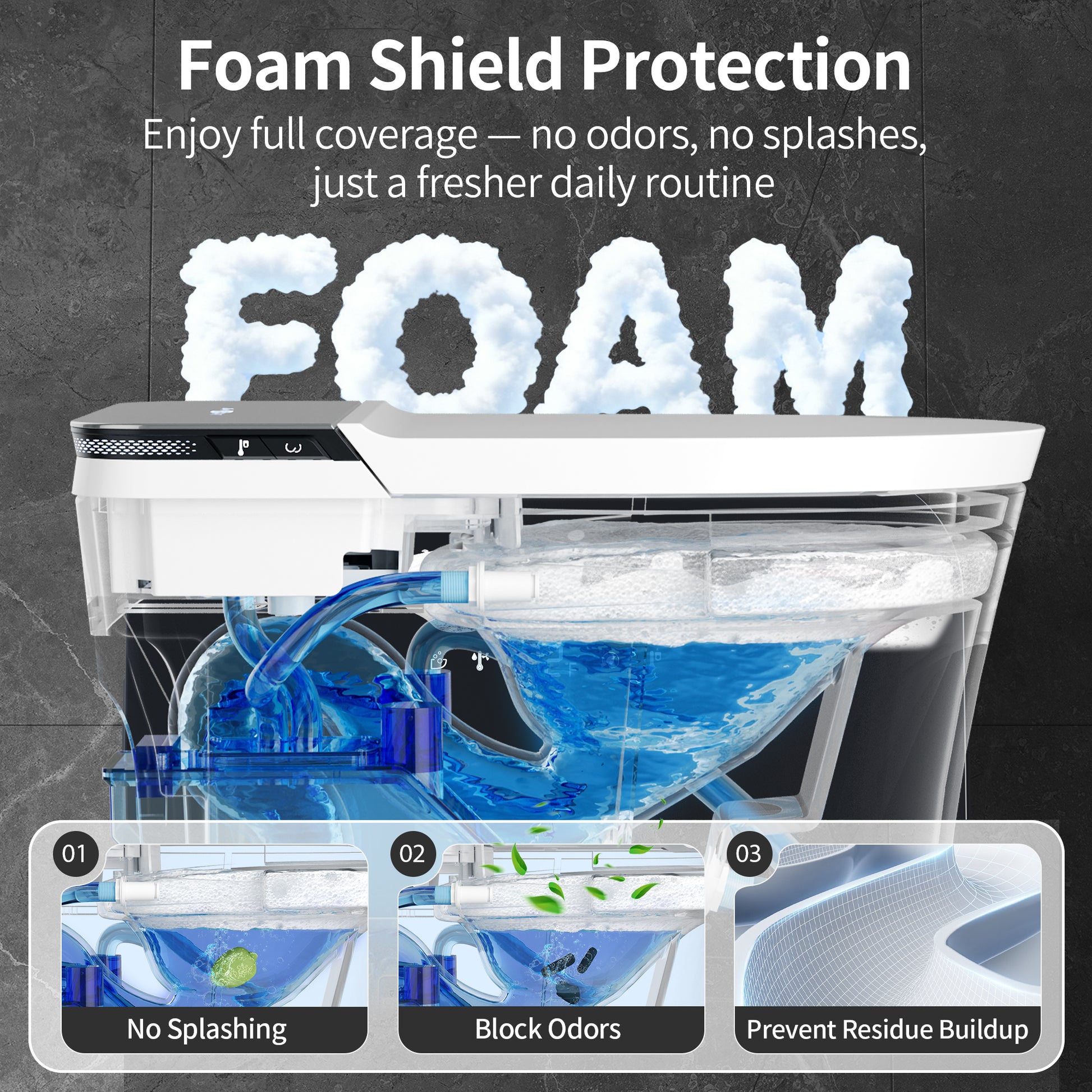 Advanced Foam Shield Protection - The bidet toilet creates a protective foam barrier that prevents splashing, blocks unpleasant odors, and reduces waste residue, keeping your bathroom cleaner and fresher.