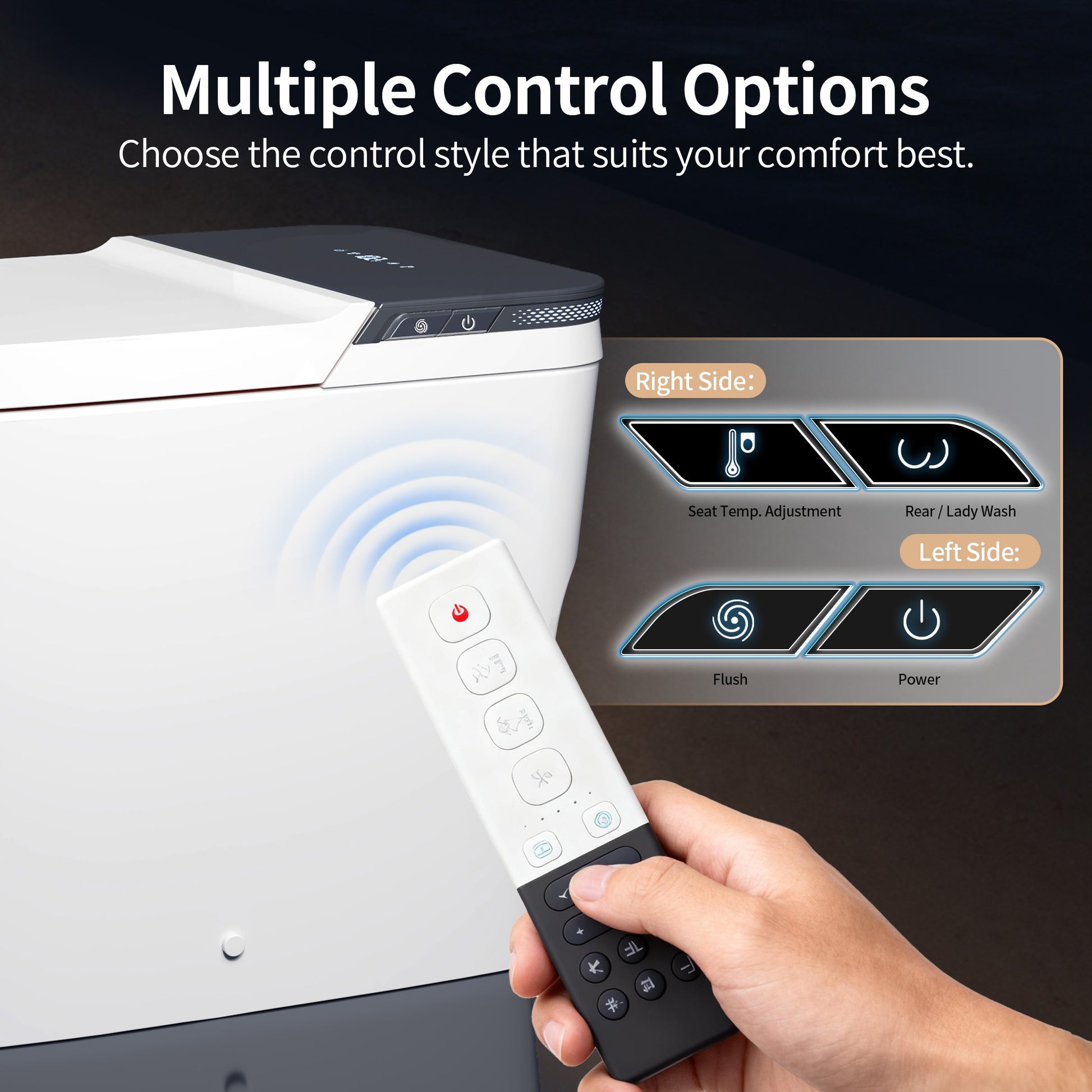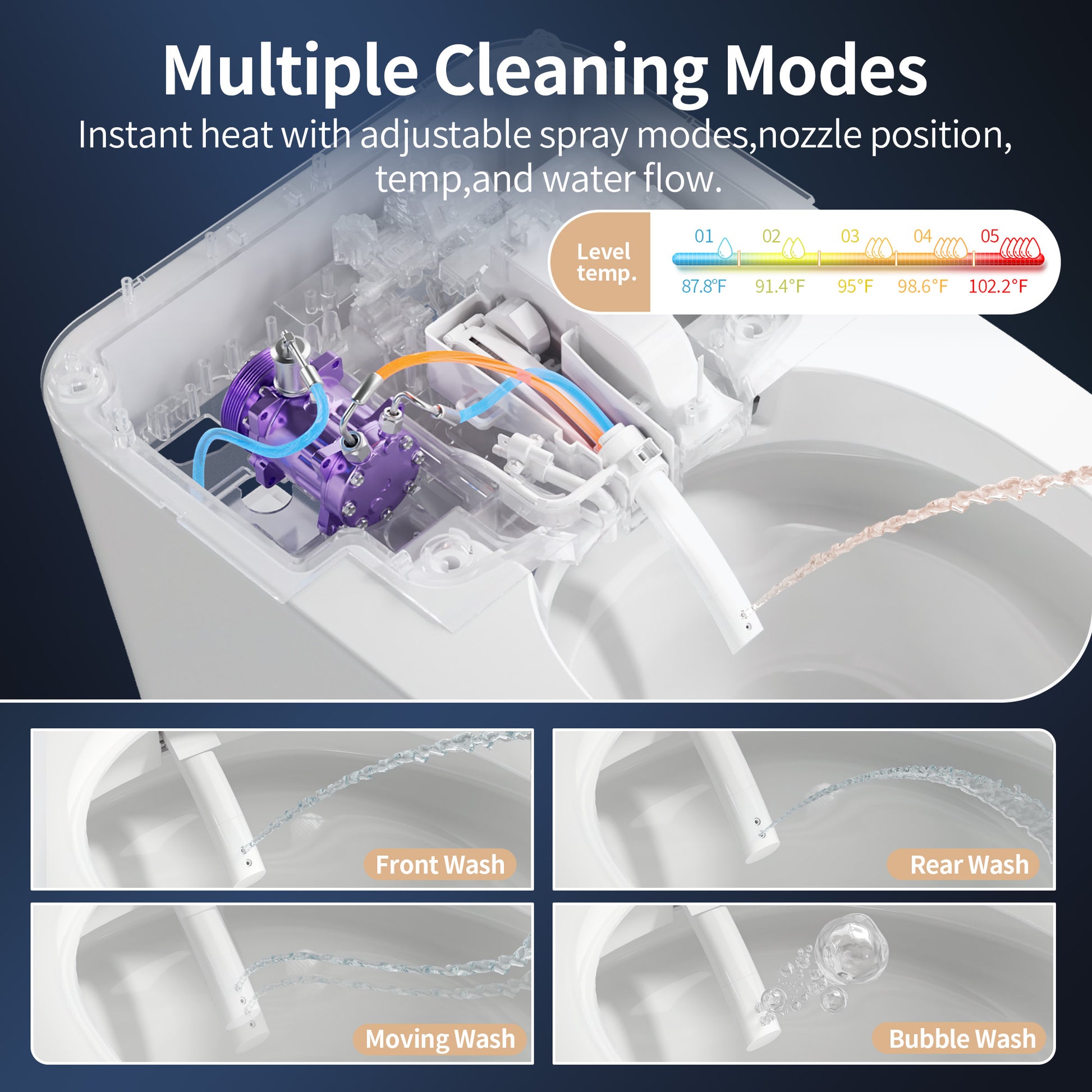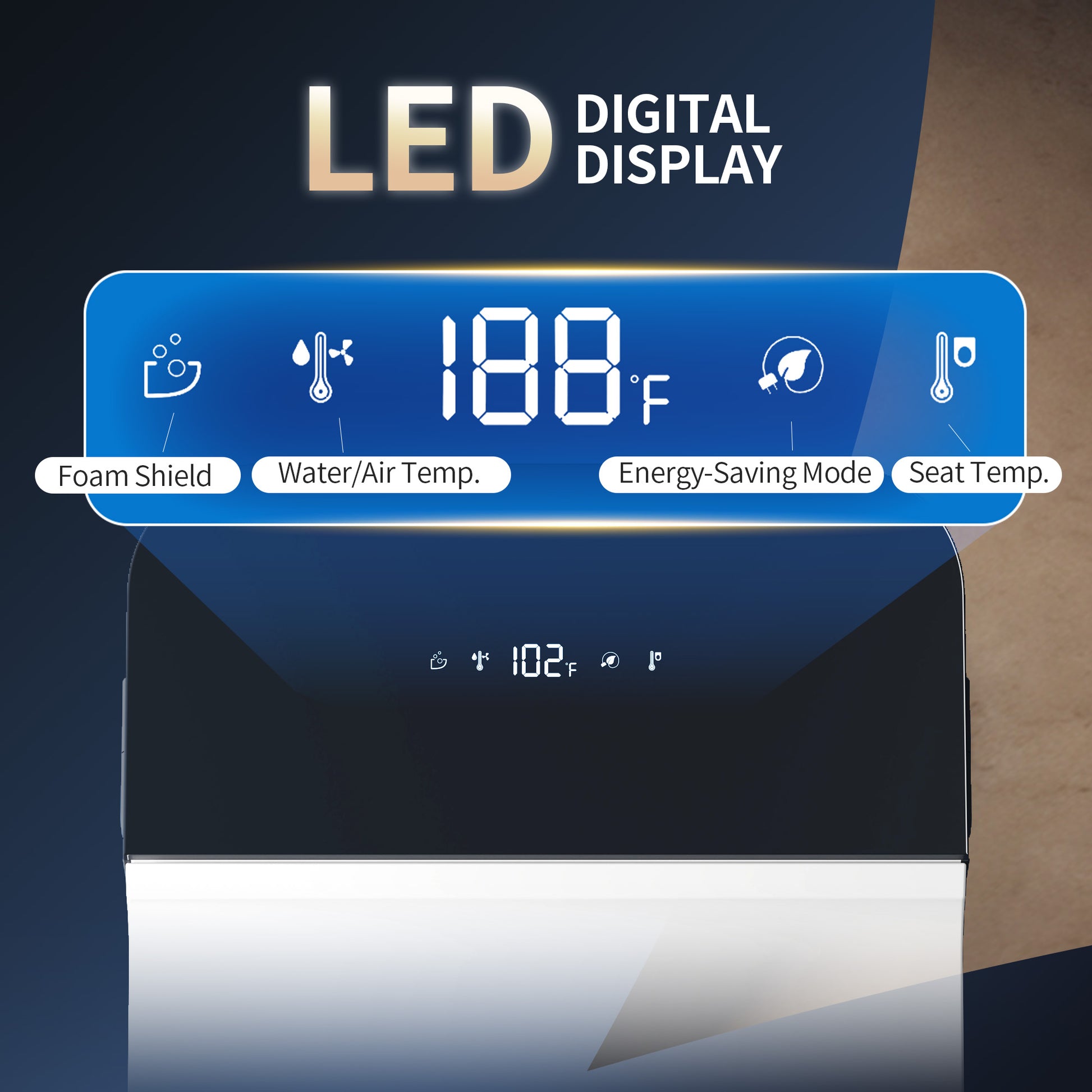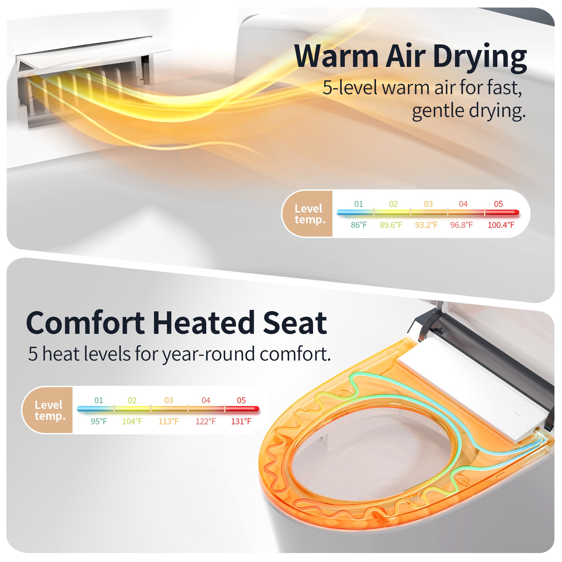 Heated Seat & Warm Air Dryer: - Stay cozy with 5 adjustable seat heating levels (86–100.4°F) and 5 warm air drying levels (95–131°F). This bidet toilet delivers year-round comfort and hands-free hygiene, eliminating the need for toilet paper.