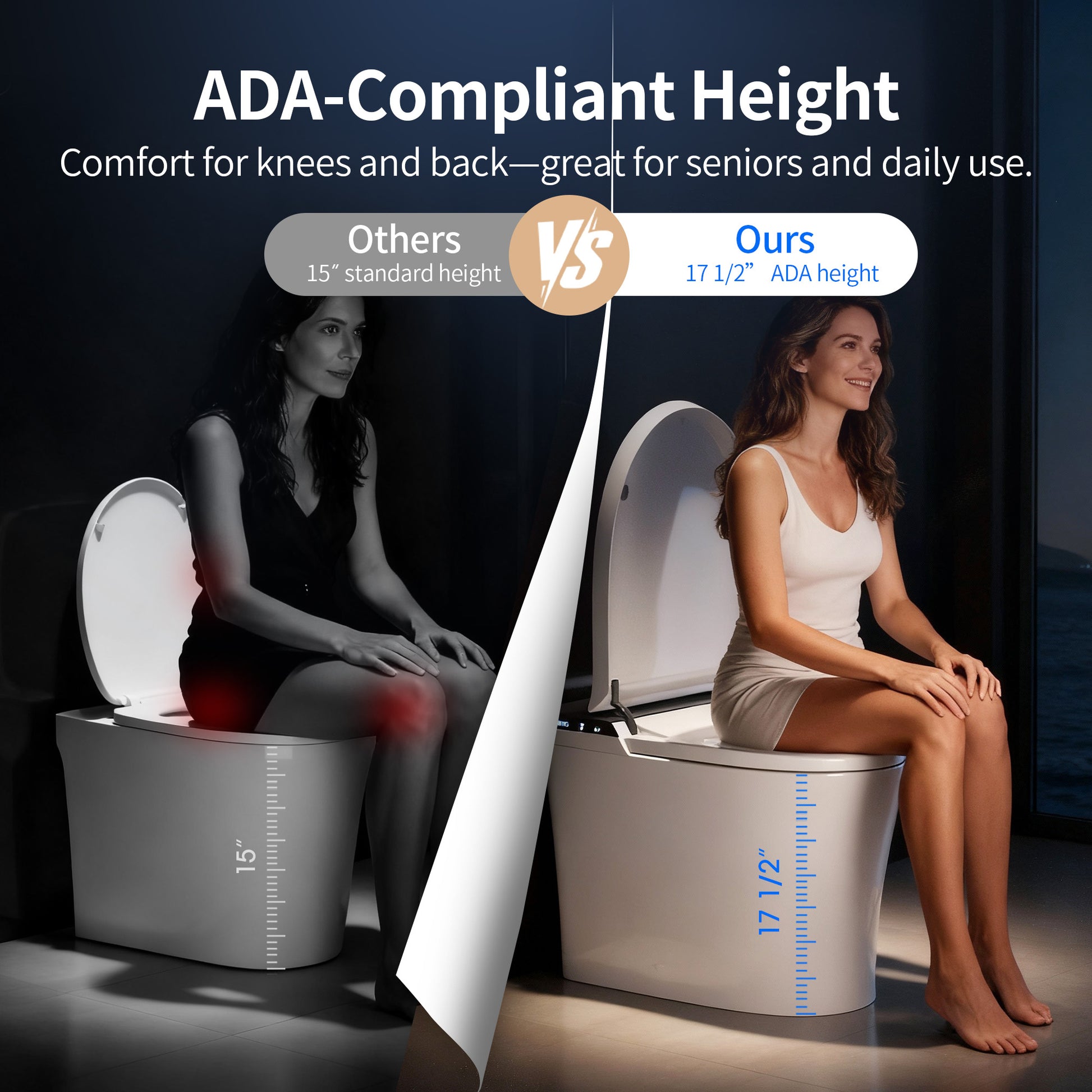 ADA Comfort Height: - Designed at 17 1/2" seat height, this one-piece bidet toilet meets ADA standards, making it easier to sit down and stand up. It offers superior comfort and accessibility for the elderly, pregnant women, and families with multiple generations.