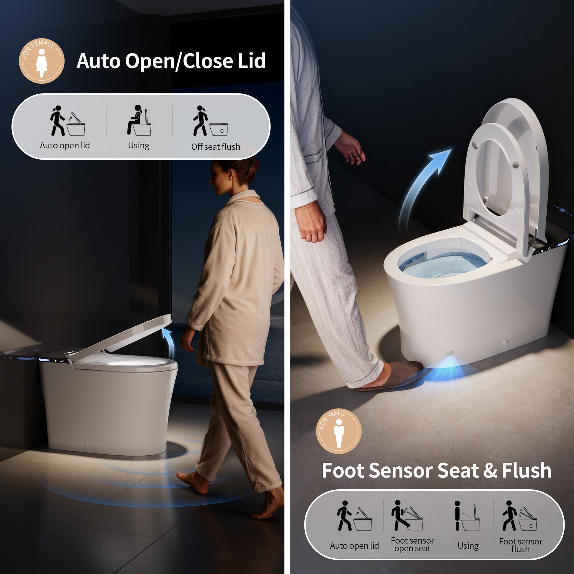 Auto Open Close Lid: The one-piece bidet toilet features a smart sensor lid that opens as you approach and closes when you leave, ensuring hands-free operation with a more hygienic and elegant experience.