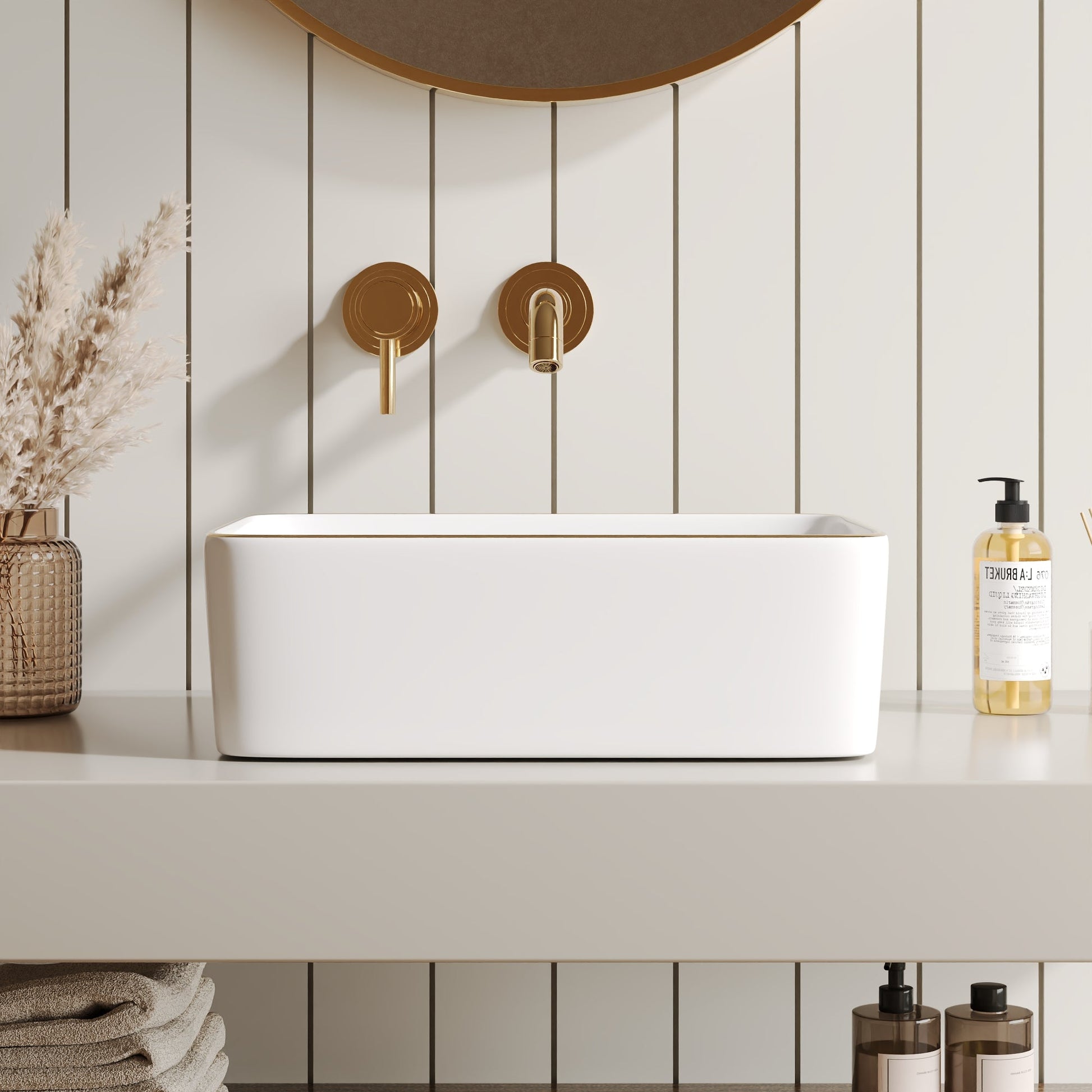 Signature Metallic Detailing: The continuous gold band accentuates the sink's geometric silhouette while hiding everyday water spots. This functional artistry ensures your basin remains a conversation piece for years to come.