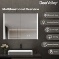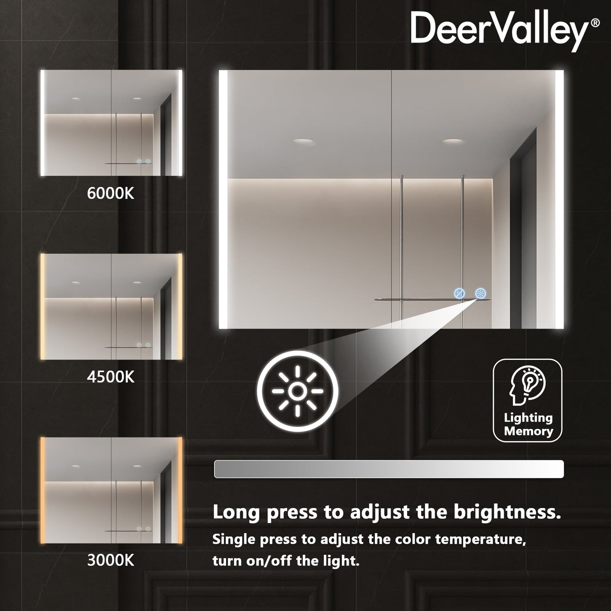 - Introducing our multifunctional LED bathroom vanity mirror with touch switch for light control and dimming, tempered glass shelves for storage, built-in Bluetooth speaker for enhanced audio, and one-touch defogging. Perfect for makeup with dual LED light strips for clear, realistic reflection. Ideal for bathrooms, bedrooms, salons, and hotels, combining style with practicality.