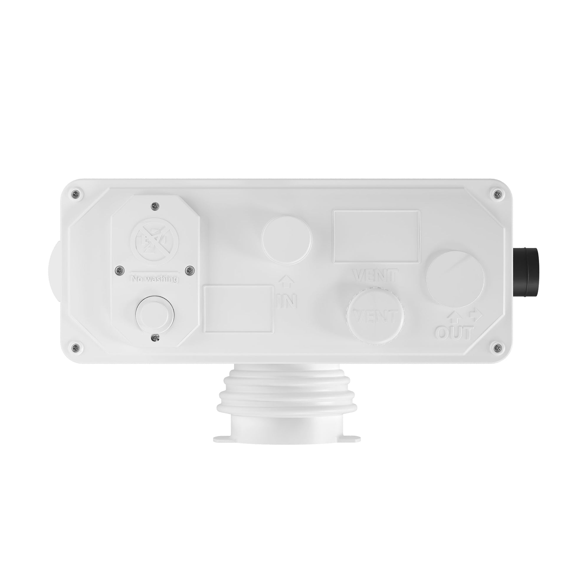 Option 1: Replaceable carbon filter cartridge (lasts 6 months) with 97% VOC capture rate. Option 2: Direct-vent compatibility using 2" PVC pipe for permanent odor elimination - Precision Plumbing Ready